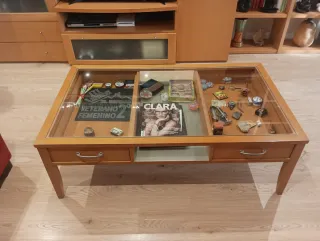 Mesa de centro de madera con dos cajones y cristal. - Encimera de cristal. - Estructura de madera. - Cajones con tiradores. Medidas: 120x70x42