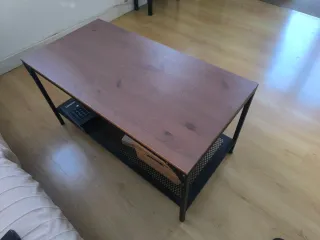 Mesa de centro Fjallbo (Ikea) con un diseño moderno y funcional. Combina una superficie de madera con una base de metal. - Estructura metálica en perfecto estado, - Tablero de madera con marcas de uso (ver fotos), - Patas regulables.