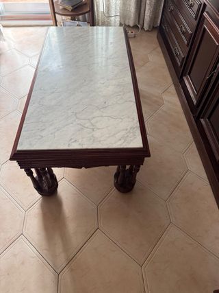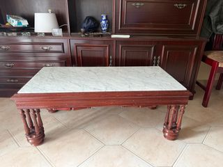 Elegante mesa baja con estructura de madera y una distintiva tapa de mármol. - Diseño clásico y robusto. - Patas talladas con detalle. - Superficie de mármol veteado. SOLO VENTA EN PERSONA