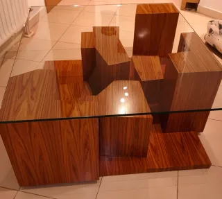 Elegante mesa de centro con un diseño único y moderno. - Tablero de cristal de 1 cm de grosor - Base con estructura en madera maciza con revestimiento dm de alta calidad. - Mesa con un diseño único ( no hay otra exactamente igual) -Marca de lujo ferrachi casa- ibermaison -Pequeños desperfectos en una esquina de la mesa y cristal ligeramente arañado( se adjuntan fotos) -Mesa muy pesada, preferiblemente trato en mano. Precio algo negociable.