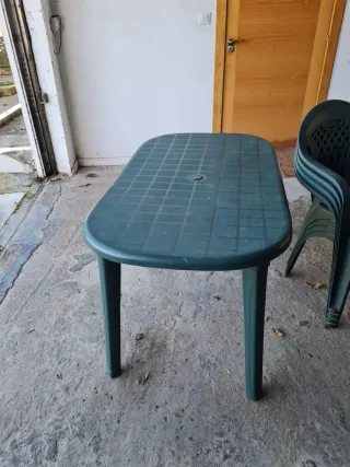 Conjunto de mesa y cuatro sillas para exterior.estan muy bien, se entregan en Santander primera playa del Sardinero a pie de calle y se puede aparcar La mesa tiene en centro para poner sombrilla y se desarma para transportar Color marrón oscuro Todo el conjunto por 55 eur, me costó más de 200 Mesa mide 90 cm ancho x 148 cm largo - Ideal para terrazas o patios. - Diseño moderno y funcional.