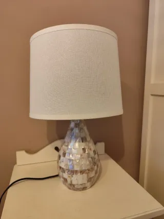 Elegante lámpara de mesa con una base de Nacar - Base con diseño de mosaico. - Pantalla de tela texturizada.