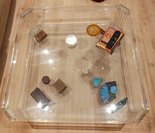 Elegante mesa de centro con un diseño moderno y minimalista. Sus dimensiones la hacen ideal para salones de tamaño mediano. - Materiales: Metacrilato y vidrio. - Medidas: cuadrada 1.1x1.1m