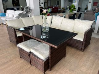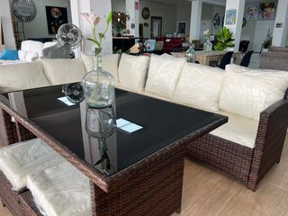 Conjunto de mobiliario de exterior para terraza o jardín. Incluye una rinconera, una mesa con superficie de cristal y dos otomanas. - Estructura de mimbre. - Cojines de asiento y respaldo. - Mesa con tapa de cristal. -Medidas 230*175cm - Disponible en marrón y gris