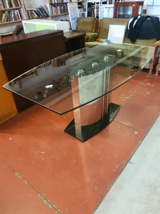 Mesa de cocina ( 1 metro x 60 cms. ) en buen estado. Su diseño moderno combina cristal y metal. - Mesa extensible hasta 1.60 cms. - Acabado superior en cristal. - Patas y estructura de metal.