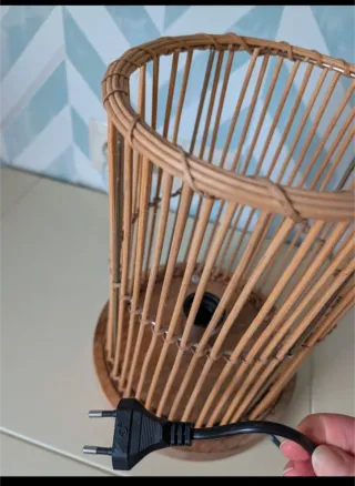 Lámpara de mesa con un diseño orgánico y cálido, perfecta para añadir un toque natural a tu hogar. - Estructura cilíndrica de varillas de fibras naturales. - Base redonda de madera. - Detalle de tejido en la parte superior e intermedia. Alto 30 cm Ancho base 22 cm Ancho superior 20 cm
