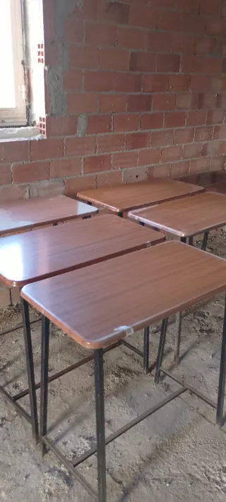 Lote de 10 mesas tipo pupitre con superficie de madera y estructura metálica. - Superficie de madera con acabado imitación madera. - Patas y estructura de metal negro. Cada mesa se vende a 10 €. Medidas: alto 73, largo 74, fondo 40 cm. A recoger en Urdilde. Concello de Rois. Necesitan limpieza.