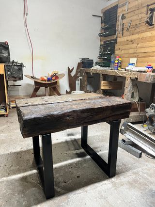Mesa de madera de castaño con base metálica