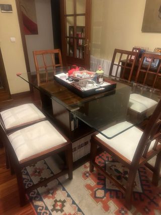 Elegante juego de comedor con mesa de cristal y seis sillas. - Mesa con superficie de cristal patas de madera wengue que son estanterías para guardar manteles, libros.. - Seis sillas de madera de teka con asientos tapizados en crema No se hacen envíos : comarca Santiago de Compostela