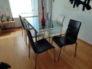 Incluye mesa rectangular extensible de cristal con estructura de madera. El mecanismo de apertura funciona correctamente. Marcas de uso normales pero buen estado general y cristal entero. Incluye 4 sillas a juego con estructura de madera y tapizado azul. A tener en cuenta: una silla tiene un par de tornillos en el respaldo (no se nota al sentarse) y otra tiene la base del cojín rota (reparación muy sencilla con una tabla de madera por debajo). Perfecto su buscas algo práctico y económico para piso de alquiler, estudiantes o segunda residencia. Tengo más muebles por mudanza en mi perfil. Podemos negociar commpra conjunta.