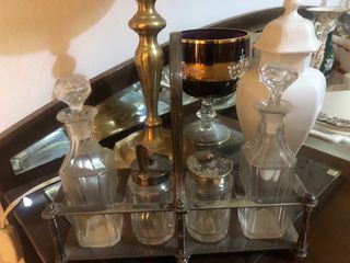Conjunto de mesa de antigüedad. - Piezas de cristal tallado. -soporte de plata - Incluye dos botellas y dos recipientes con tapa.