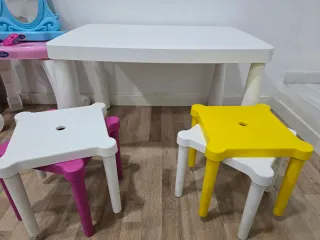 Conjunto de mesa infantil y cuatro taburetes de Ikea. Ideal para que los más pequeños jueguen y aprendan. Modelo mesa MAMMUT Modelo taburete UTTER En perfecto estado. Apenas se ha usado