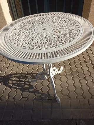 Elegante mesa redonda de aluminio con un diseño intrincado y decorativo. Perfecta para exteriores. - Tablero con motivos florales calados. - Base de cuatro patas ornamentadas. - Borde exterior con diseño de rejilla.