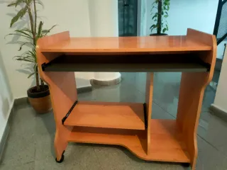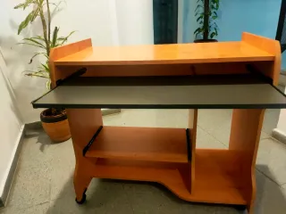 Mesa de ordenador con diseño funcional y práctico. Cuenta con una bandeja extraíble para el teclado. - Bandeja extraíble para teclado. - Estantes inferiores para almacenamiento. Cuatro ruedas en perfecto estado. Sólo tiene una pequeña mancha en tablero superior