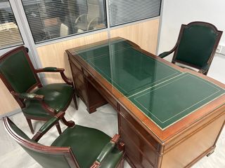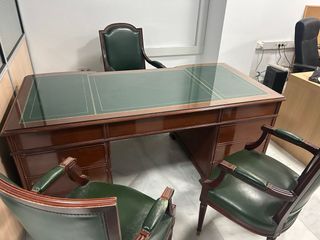 Elegante mesa de despacho de estilo inglés, con un diseño clásico y acabados de calidad. - Tablero con superficie de cristal y detalles en piel. - Estructura de madera robusta. - Cajones integrados para almacenamiento. - sillon, 2 sillas y mesa auxiliar