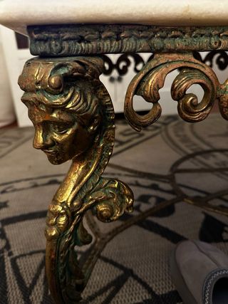 Elegante mesa de centro con un diseño clásico y sofisticado. - Tablero de mármol. - Base y patas de bronce con detalles ornamentales.