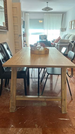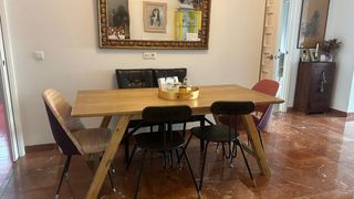 Mesa de comedor con superficie de madera y patas de madera. - Diseño moderno y funcional - Amplia, para varias personas - Acabado natural de la madera, da calidez y personalidad a la estancia. Bastantes marcas de uso en la mesa, y patas astilladas - por eso la vendo a este precio (me costó muy cara). Ideal para dar un toque vintage o para restaurar. Recogida en San Vicente de Paul (Triana)