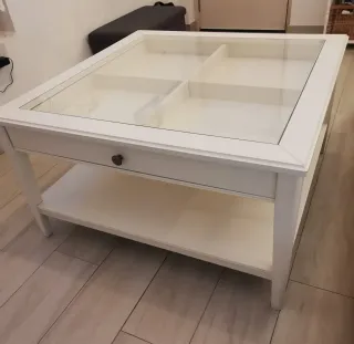 Elegante mesa de centro con un diseño moderno y funcional. Su superficie de cristal permite ver el interior, ideal para almacenar objetos. - Acabado en blanco. - Tapa de cristal. - Compartimentos interiores. - Se entrega desmontada y para recoger en domicilio