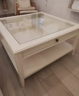 Mesa de centro blanca con tapa de cristal y cajón.