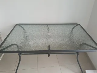 Mesa de jardín con superficie de cristal y estructura metálica. Sombrilla gris a juego. Medidas 140x90x70. Posibilidad de otra sombrilla color crudo por 40€. - Diseño moderno y elegante. - Patas resistentes para mayor estabilidad. - Ideal para exteriores. - Tiene algunos desconchones.