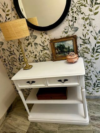 Elegante mesa con estructura de forja y detalles en madera pintada a mano. En blanco roto. - Motivos decorativos únicos. - Diseño artesanal. PRECIO NEGOCIABLE. VENTA SOLO EN PERSONA NO ENVÍO SE VENDE SOLAMENTE MESA, NO SE ENTRAN EN EL LOTE, NI LOS ADORNOS ENCIMA DE LA MESA NI DEBAJO EN EL SUELO.