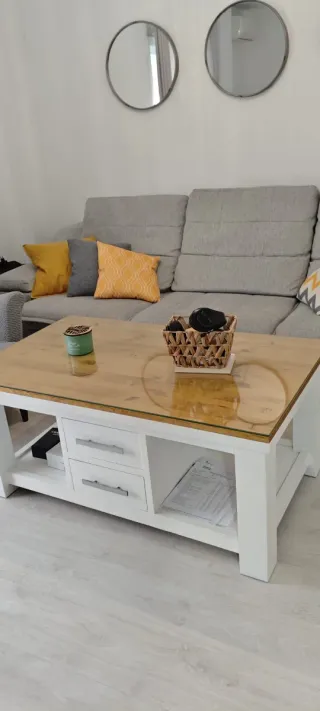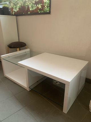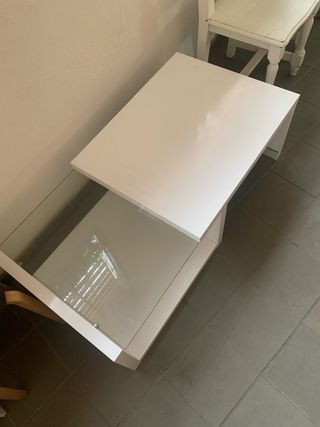 Elegante mesa de centro para el salón con un diseño moderno. - Superficie principal en color blanco. - Dos inserciones rectangulares de cristal esmerilado. - Estructura de madera. Tiene estropeada una de las varillas para subirla. Hay que ayudarla manualmente a subirla y hace su función correctamente. Pesa mucho. Solo tiene además del fallo del engranaje, lo que marca la última foto, un poco levantado el material. La altura levantada es de 55 centímetros. Perfecta para comer sentados en el sofá.