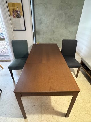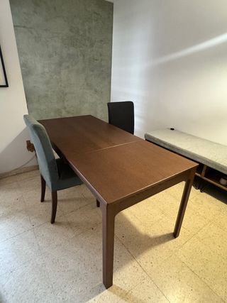 Conjunto de mesa de comedor extensible y dos sillas. Perfecto estado: - Mesa con acabado en madera. - Sillas tapizadas en tela.