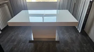 Elegante mesa de comedor con un diseño moderno y funcional. Su superficie extensible la hace perfecta para adaptarse a diferentes ocasiones. Su precio de compra fue de 850€. - Acabado brillante en color blanco. - Base central con detalles metálicos. - Extensible a 220