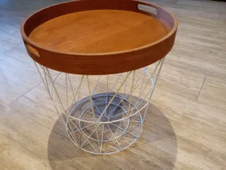 Mesa auxiliar con un diseño moderno y funcional. La parte superior es de madera y la base es de metal. - Tablero redondo de madera. - Base de alambre metálico. - Asas integradas en el borde de madera.
