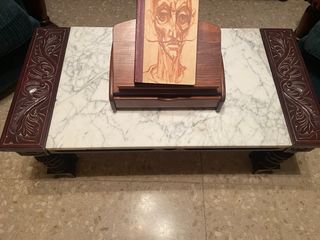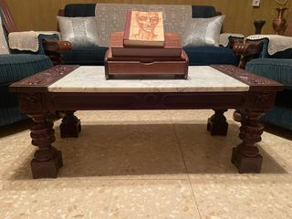 Elegante mesa baja con superficie de mármol y estructura de madera. - Diseño clásico con detalles tallados. - Patas robustas y ornamentadas.