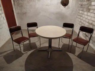 Conjunto de mesa redonda y cuatro sillas, ideal para tu cocina o comedor. - Mesa con sobre en color beige. - Sillas con asiento y respaldo en color marrón. - Estructura de las sillas y patas de la mesa en metal.