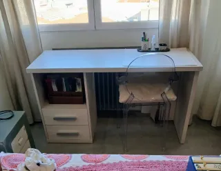 Escritorio funcional con un diseño moderno. - Superficie de madera clara. - Dos cajones con tiradores metálicos. - Compartimento abierto para almacenamiento. - Silla transparente de plástico incluida.