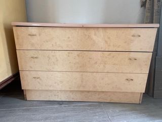 Conjunto de muebles de dormitorio compuesto por una cómoda y dos mesitas de noche. - Diseño moderno con acabado veteado. - Detalles en color rosa en los bordes superiores. - Tiradores dorados en cada cajón. Tienen desperfectos en los canteados como se puede ver en las imágenes. Medidas mesita: 51,5 cm ancho x 34,5cm fondo x 45,5cm alto Medidas cómoda: 101,5 cm ancho x 65,5cm alto x 38 cm fondo
