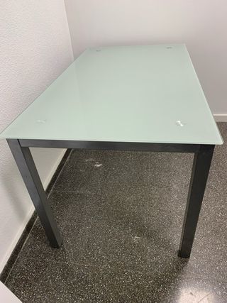 Elegante mesa con superficie de cristal negro y estructura metálica. - Diseño moderno y minimalista. - Patas metálicas robustas. Seria para recoger en marzo antes no