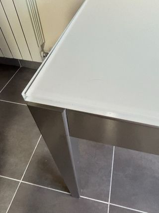 Conjunto de mesa de comedor con superficie de cristal y sillas con estructura de madera. - Mesa con sobre de cristal. - Sillas con detalles en madera. - El cristal tiene unas grietas pero son interiores, las tiene desde hace mucho tiempo , no afecta al tacto ni por arriba ni por abajo, y no se va a romper. la mesa y sillas tienen su uso pero con un poquito de bricolaje se quedan perfectas, eran marrones y las pintamos blancas, sería volver a repintar únicamente. - La mesa es extensible, pasa de 160 cm a 220 cm - Se puede ver sin compromiso ninguno.