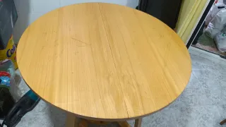 Mesa de cocina en buen estado, con acabado en roble chapado. No tiene el cajón. Cerrada mide 39 de fondo, abierta el doble 78. En las fotos se ve bien. - Diseño clásico y funcional. - Patas de madera robustas.