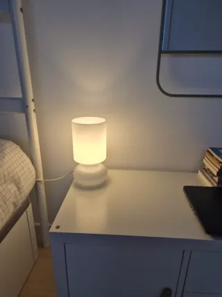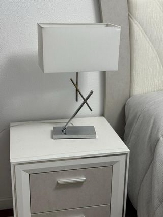 Set de dos lámparas de mesa con un diseño moderno y elegante. Perfectas para añadir un toque de estilo a tu hogar. - Base y estructura metálica. - Pantalla de tela. Precio original 79,95€ cada una. Se venden por 50€ cada una.