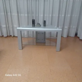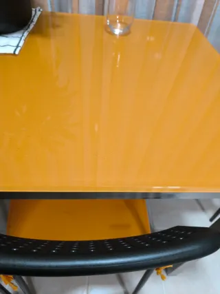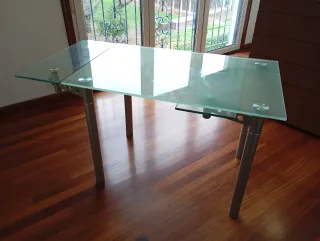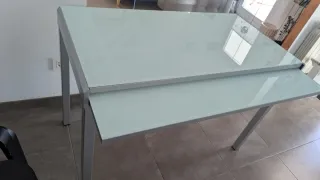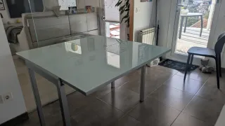Mesa de cocina con tablero de cristal Las patas son en inox Muy resistente y cómoda De largo 110cm y de ancho 70cm Tiene alguna marca de uso en el cristal pero en general está en muy buen estado Solo recogida en domicilio
