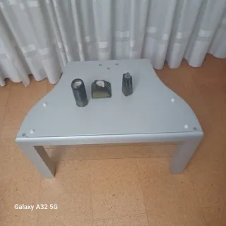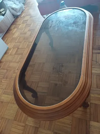 Mesa baja de madera, usada pero en buen estado. Mide 48 cm. de alto, 54 cm. de fondo y 130 cm. de ancho.