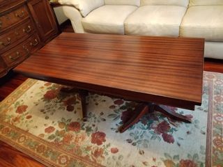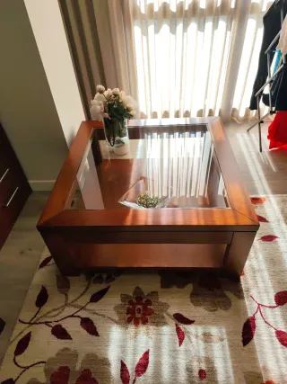 Elegante mesa de centro de madera maciza con un diseño clásico que aportará calidez a tu salón. - Acabado en tono marrón oscuro. - Patas robustas y decorativas. - Superficie amplia y lisa. Precio negociable.