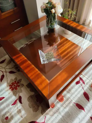 Elegante mesa de salón con un diseño clásico y acabados cuidados. - Encimera de cristal. - Patas y estructura de madera. - Tonos marrones y transparentes.