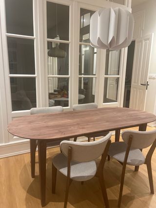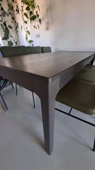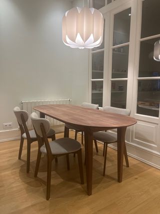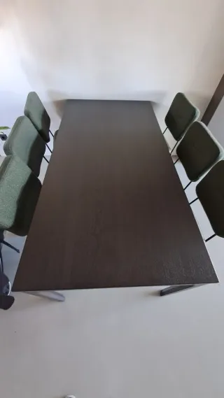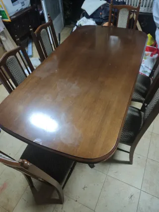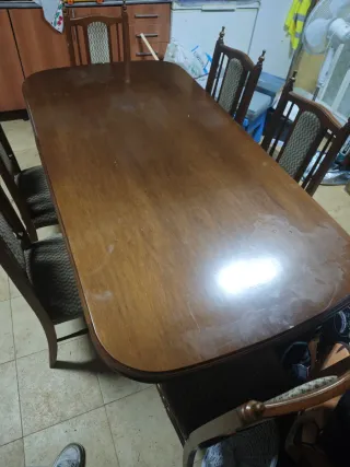 Elegante mesa de comedor con un acabado de madera cálido. Perfecta para reuniones familiares o cenas. 6 sillas incluidas. Si vienes está semana te la llevas en 100 euros.
