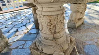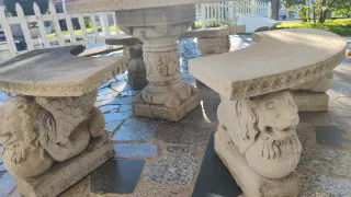 Conjunto de mesa y bancos de piedra con un diseño único y detallado. - Piezas talladas con motivos ornamentales. - Acabado en tonos piedra natural. Mesa diámetro 1 m Con bancos diámetro 1,90 m Tiene desperfectos de grietas normales del tiempo Está completo