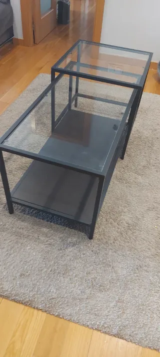 Conjunto de mesas auxiliares de centro con un diseño moderno. - Superficie superior de cristal. - Estructura metálica. - Diseño de dos niveles. Medidas mesa grande; 90x45x45 cm Medidas mesa pequeña; 50x50x50 cm
