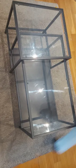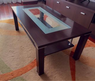 Mesa de centro de salón en elegante color wengué, con cristal central integrado. Diseño moderno, robusto y muy práctica. ✅ Estructura sólida y estable ✅ Cristal decorativo y resistente ✅ Bandeja inferior ideal para revistas, mandos o libros 📚 ✅ Color oscuro fácil de combinar ✅ Muy buen estado, bien cuidada 👍 📏 Medidas: 110 cm largo × 60 cm ancho × 45 cm alto
