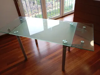 Elegante mesa de cocina con superficie de cristal y patas de metal. Mide 110 cm y extendida 165. Recogida en Cangas, no se hacen envíos.