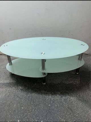 Elegante mesa de centro con un diseño moderno y funcional. Cuenta con dos niveles para mayor espacio de almacenamiento o exhibición. - Superficie ovalada de cristal templado. - Estructura con patas metálicas.
