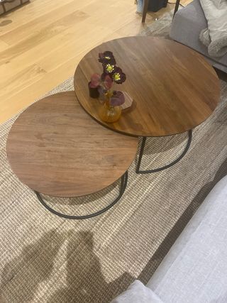Conjunto de dos mesas de centro redondas con un diseño moderno. La grande: 80 cm de diámetro La pequeña: 62 cm diámetro - Tableros de madera. - Patas de metal negro.