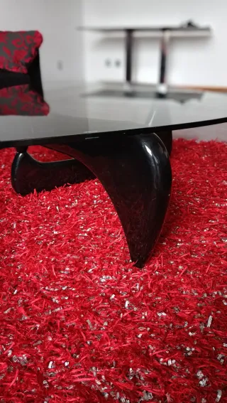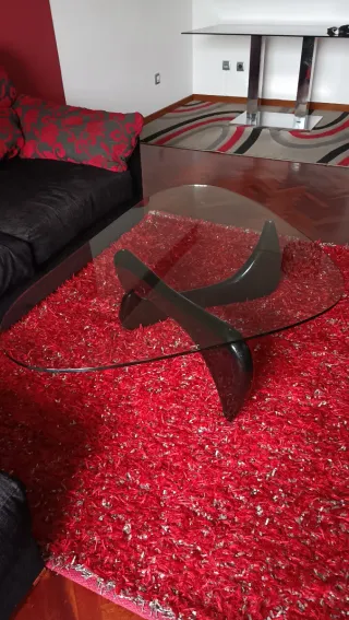 Mesa de centro con diseño moderno. - Tablero de cristal templado transparente. - Base de plástico negro con forma escultural.