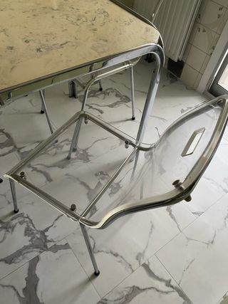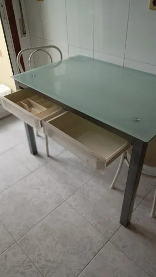 Conjunto de mesa de cocina con superficie de cristal y estructura metálica, que incluye dos cajones, uno con cubertero. Se regalan dos sillas. A recoger en Vigo - Mesa con sobre de cristal. - Estructura metálica. - Dos cajones integrados. - Incluye dos sillas.